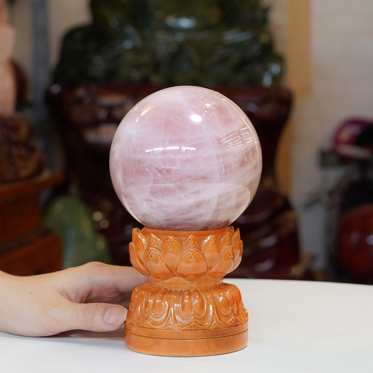 Quả cầu Thạch Anh hồng 1A 1,7kg – 10,8cm + đế gỗ hình sen