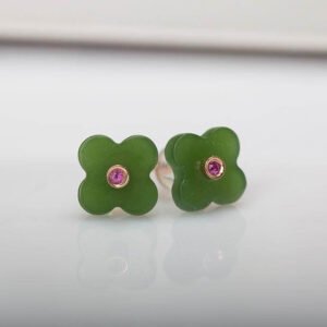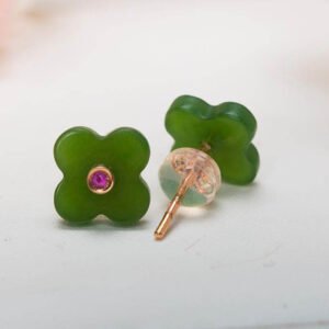 Vàng 18K Hoa Tai 4 Lá Ngọc Bích Nephrite Đính Ruby
